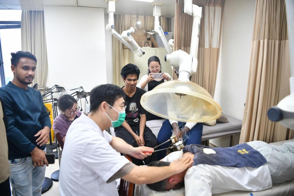 活动首站,师生们来到江西中医药文化馆。馆内陈列的古籍、药材标本、传统制药器具等,仿佛是一部部生动的史书,诉说着江西中医药发展的千年历程。大家驻足观看,认真聆听讲解,对江西中医药文化的源远流长有了更深刻的认识。随后,在药学院中药鉴定教研室,一场别开生面的中药美绘活动精彩上演。在专业老师的指导下,大家拿起画笔,用画笔描绘中药形态,在艺术创作中加深对中药的认知。药膳体验环节,一道道色香味俱佳的药膳端上餐桌,大家在品尝美味的同时,了解药膳的养生功效,感受中医药与美食的完美融合。最后,师生们来到江西中医药大学附属医院,体验艾灸、拔罐、推拿等中医诊疗项目。专业医师现场讲解操作要点与养生知识,让大家亲身感受到中医药在疾病治疗和养生保健方面的独特魅力。