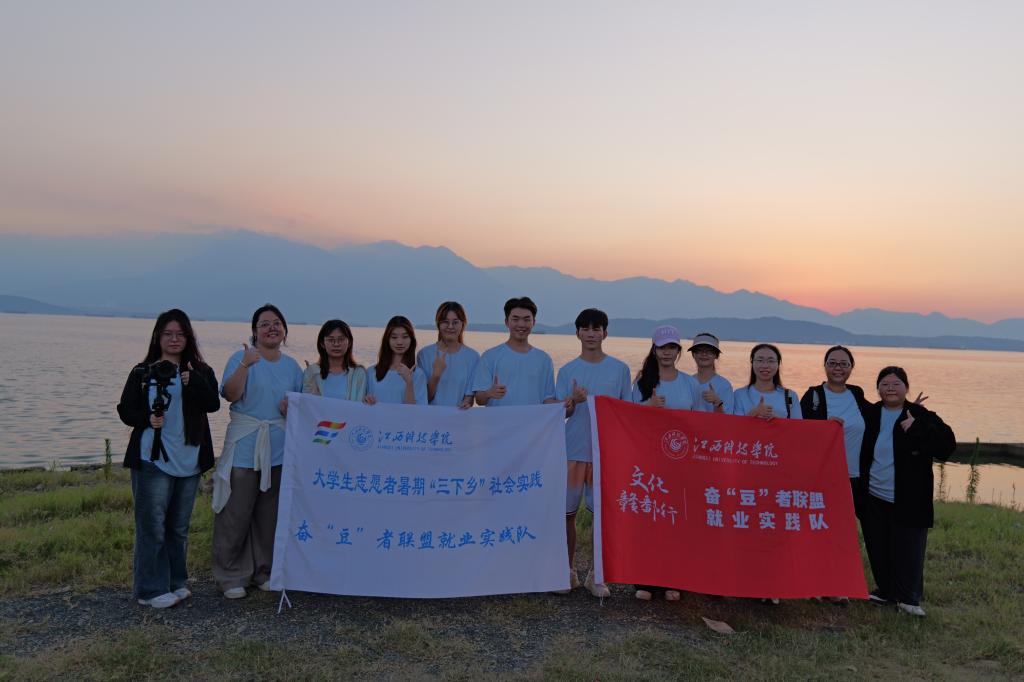 暮色四合,金辉浸染湖面,实践队师生奔赴辽阔的鄱阳湖湿地,开展深度生态考察。微风轻拂,水波温柔荡漾,波光粼粼处,落霞与孤鹜齐飞,成群的白鹭掠过天际。清澈的水下,丰茂的水草摇曳生姿,江鱼自在游弋,螺蚌静栖沙底,共同勾勒出一幅生机勃勃、万物有灵的自然图景,完美诠释着人与自然和谐共生的至美境界。师生们躬身实践,细致清理湖边散落的垃圾;驻足远眺这无垠的生态画卷,耳畔是归鸟的鸣唱,鼻息间是湿润的草木芬芳,沉浸式感受“绿水青山就是金山银山”理念在鄱阳湖畔的生动实践。这一刻,湿地不仅是风景,更是生命交织共荣的家园,让团队一行深刻理解保护这片生态净土,维系其精妙平衡,正是实现生态保护与经济发展协调并进、永续繁荣的基石所在。