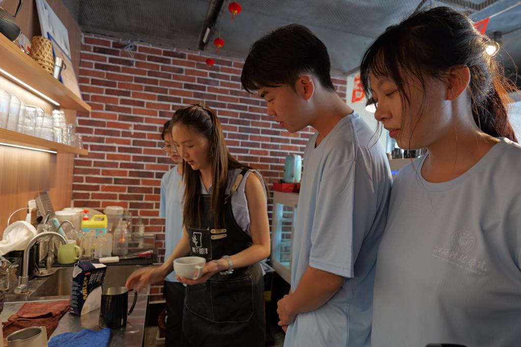 在王燧湾绿荫掩映的“树下咖啡馆”里,实践队师生与80后返乡创业代表、王燧湾景区运营公司总经理涂强围坐一堂,展开深入交流。涂强热情分享了其团队如何将深厚本土文化与现代消费潮流巧妙结合的创业经验:“我们以‘咖啡+鄱阳湖’为独特IP,成功打造了湖口县首家乡村咖啡馆。” 这一独具匠心的创新实践,不仅生动展现了中华传统水乡文明与西方现代休闲文化的有机融合,更为探索文旅赋能乡村振兴提供了一个鲜活的样本,极大地拓宽了同学们对乡土资源创新转化与创新创业路径的具象化视野。