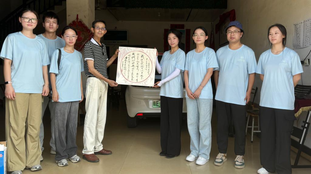 在富林村,实践队与当地红色歌舞剧团团长聂老师进行深入交流。聂老师夫妇现场表演了精心编排的双人舞,并以遒劲有力的笔法书写了方志敏《可爱的中国》中著名的一段话:“这时,我们民族就可以无愧色的立在人类的面前……与世界上各位母亲平等的携手了。”随后,在聂老师的指导下,全体队员共同学习了红色歌曲《万疆》,嘹亮的歌声在革命旧址久久回荡,当地的红色文化以独特新颖的方式生动地展现在团队面前。