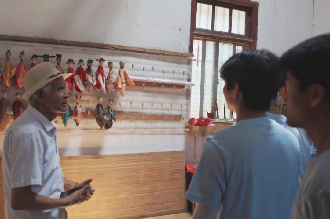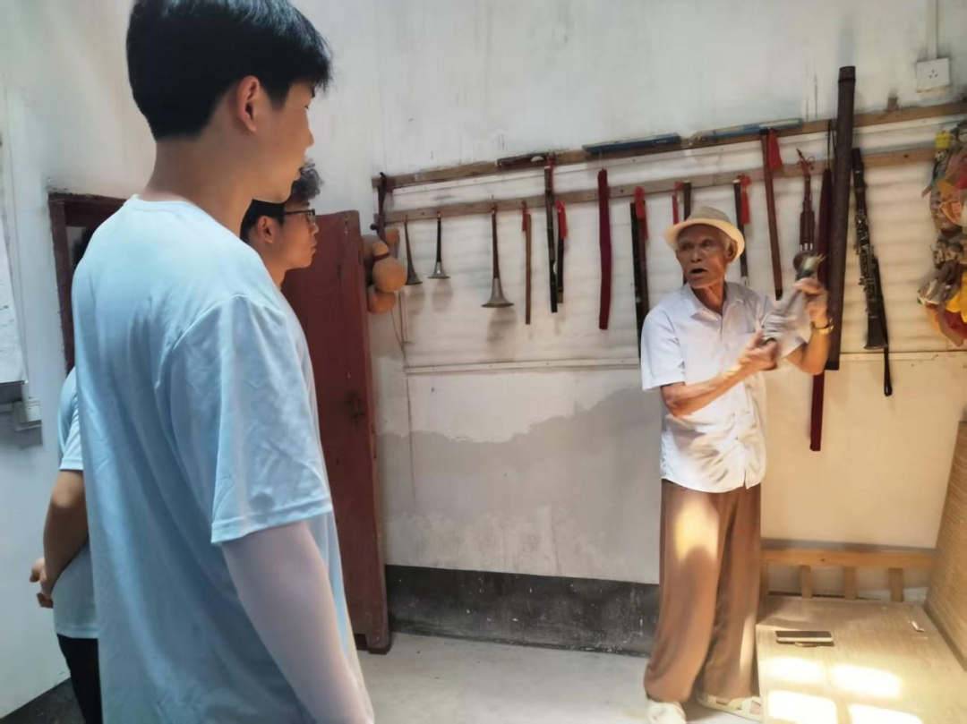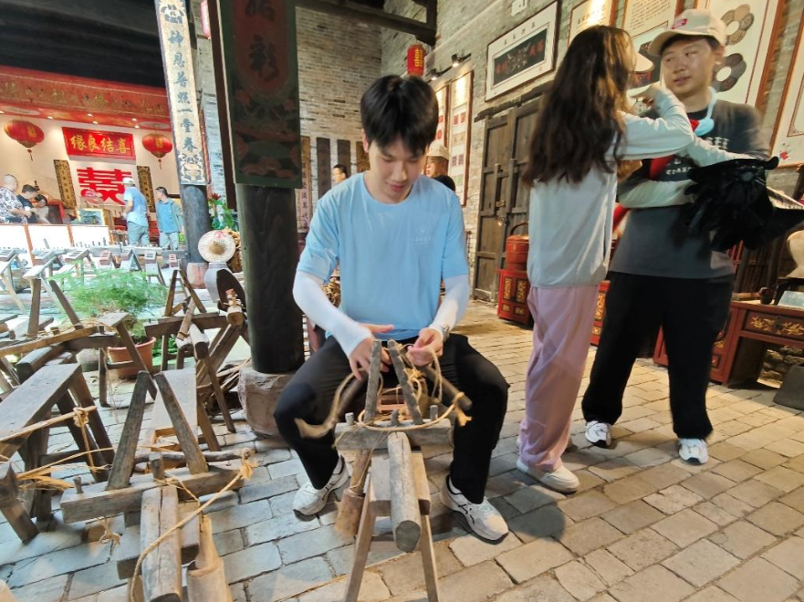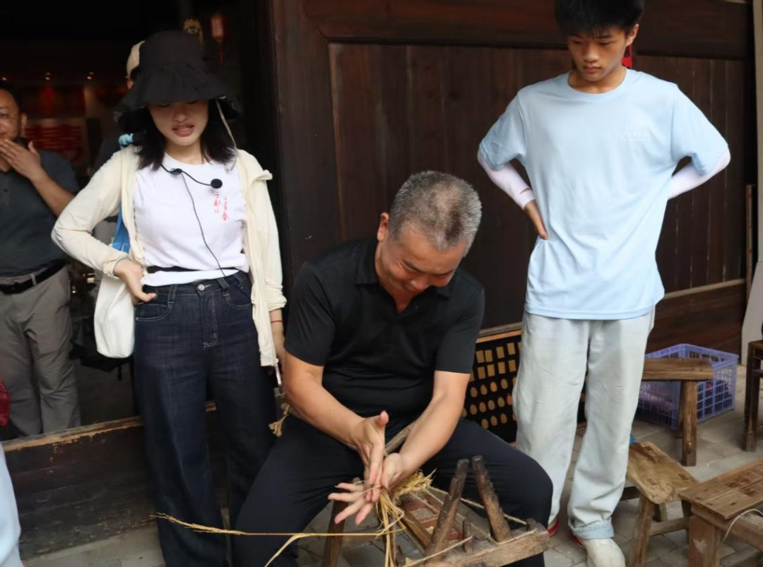 “强农有我,摘星助农”志愿服务团踏入于都红色文化基地,开启红色传承之旅。队员们在客家非遗文化基地遇见国家级非物质文化遗产客家古文省级代表性传承人肖秋林老艺人,围坐聆听其讲述客家古文韵律与布偶戏故事,手工雕琢的木偶承载着代代匠心;展厅内,勾筒、渔鼓筒等传统乐器与《红军渡》古文唱段的电子屏相映,馆长介绍客家古文曾是革命时期的“流动喇叭”,展柜中泛黄的《十送红军》唱本手稿字迹铿锵。团队还走进长征源民俗博物馆,在草鞋编织点观看老师傅操作,透过稻草穿梭的动作,感受当年红军出发的坚定与百姓相送的热忱,深刻理解草鞋作为长征精神载体的意义。