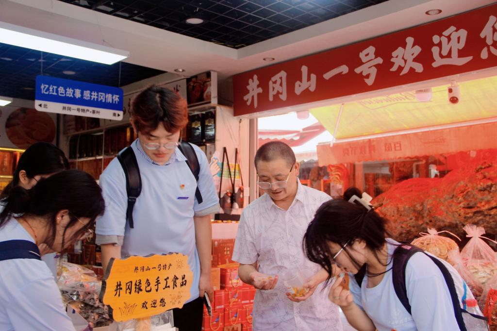 在茨坪天街,通过实地走访和对当地商家及消费者的调研发现,队员们积累了大量珍贵依据,为后续打造独具井冈山精神底蕴的“红韵绘农”系列产品注入了源头活水。“学、讲、研、践”的一体化模式引导团队深入思考,将“让历史可亲、可感、可带走”的转化逻辑融入“红韵绘农”品牌塑造与农产品包装设计中,探索红色基因与设计赋能乡村的融合范式。