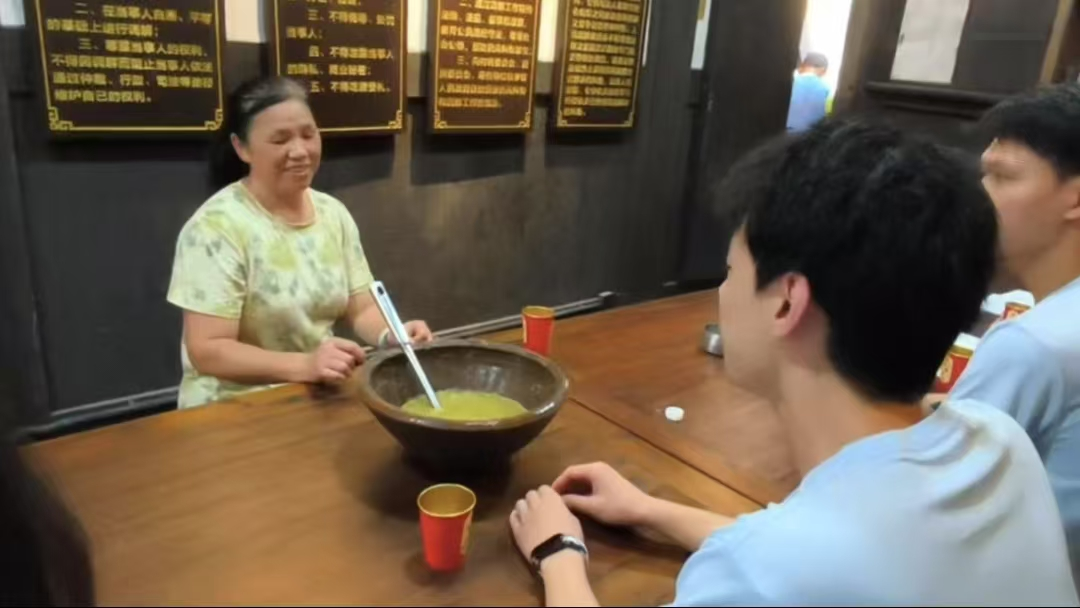队员们还在白鹭村探索非遗传承,向擂茶非遗传承人学习制作技艺。从备料(茶叶、熟花生、芝麻等)到用石榴木擂槌在牙钵中研磨,再到冲煮成饮,队员们亲手体验全过程。擂茶作为客家人待客的佳饮和情感纽带,其传承人阿婆分享的婆媳相授故事,更让队员们体会到非遗文化生生不息的生命力。