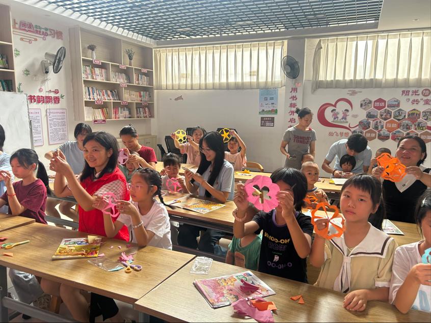 实践尾声,队员们在南亨乡新时代文明实践站开展“大手拉小手,共筑童心梦”活动,亲子共读防溺水绘本将安全教育融入互动;耐心指导的剪纸教学让传统文化在稚嫩指尖焕发生机;“蒙眼原地踏步”“趣味投球”等游戏环节充满欢声笑语。活动结束,队员们为孩子们送上精心准备的学习用品。