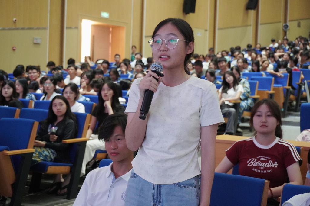 “怎样选择适合自己的竞赛?”“如何平衡学习、社团与实践?”“如何保持学习和实践的激情和热情?”“零基础如何迈出学口语的第一步?”现场还进行互动提问环节,现场反响热烈,同学们积极讨论,踊跃发言,学长学姐们耐心为同学们解答,同学们听得津津有味,纷纷表示受益匪浅,将以饱满的热情投入到大学四年的学习生活中,实现全面发展。