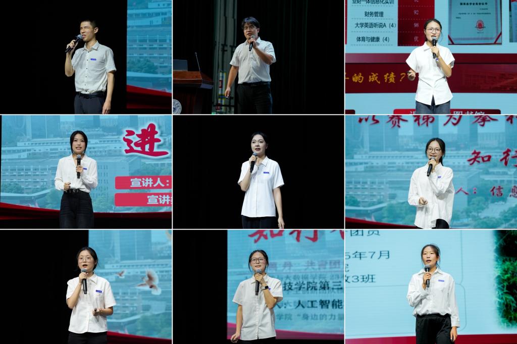 宣讲团成员万青从夯实学习基础、积极参与实践、传递自强价值三方面,鼓励新生主动探索学习路径,勇于走出舒适区,将长期目标拆解为短期任务,让大学生活既充实又有温度。宣讲团成员彭睿婕以自身突破“哑巴英语”、实现全面成长的经历为核心,从打破学习困境、分享英语学习技巧、积极参与竞赛实践三方面,分享她的奋斗故事。宣讲团成员沈欣媛鼓励新生要积极向身边优秀看齐,深耕专业领域,兼顾全面发展,勇敢突破自我,让大学生活在尝试与奋斗中不留遗憾。宣讲团成员张艺丹分享自己从刚入学时的迷茫与焦虑,到通过竞赛、社团和创业逐步找准方向、实现自我突破的成长历程。宣讲团成员沈沛琳以自身经历鼓励新生将知识转化为能力,积极投身“三下乡”“扬帆计划”等社会实践,在积累中塑造自我。宣讲团成员葛丹结合从竞赛小白到团队负责人的经历,鼓励新生要主动探索方向、敢于试错,要正视过程中的挫折。宣讲团成员林欣瑶分享了自己在奔跑的青春中成就自我,实现健康的生活方式与人格成长的双重奏。