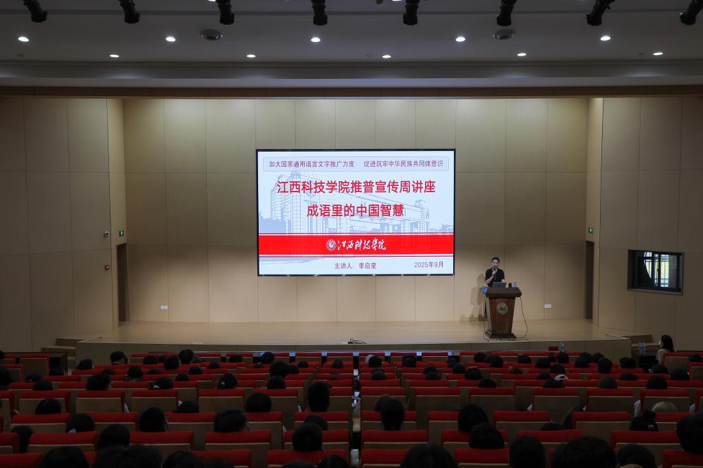 江科网讯(记者 何强江)9月19日下午,我校在报告B厅举办第28届全国推广普通话宣传周“成语里的中国智慧”主题讲座。国家级普通话测试员、江西省第17届普通话优秀测试员李启星老师主讲。讲座由教务处副处长刘永浪主持。