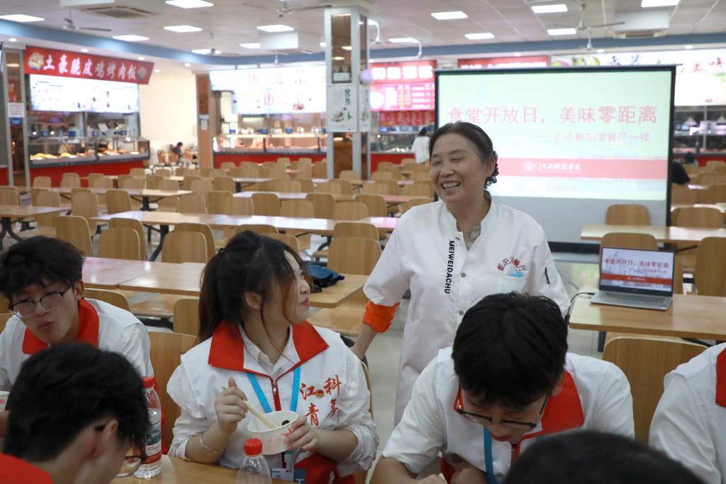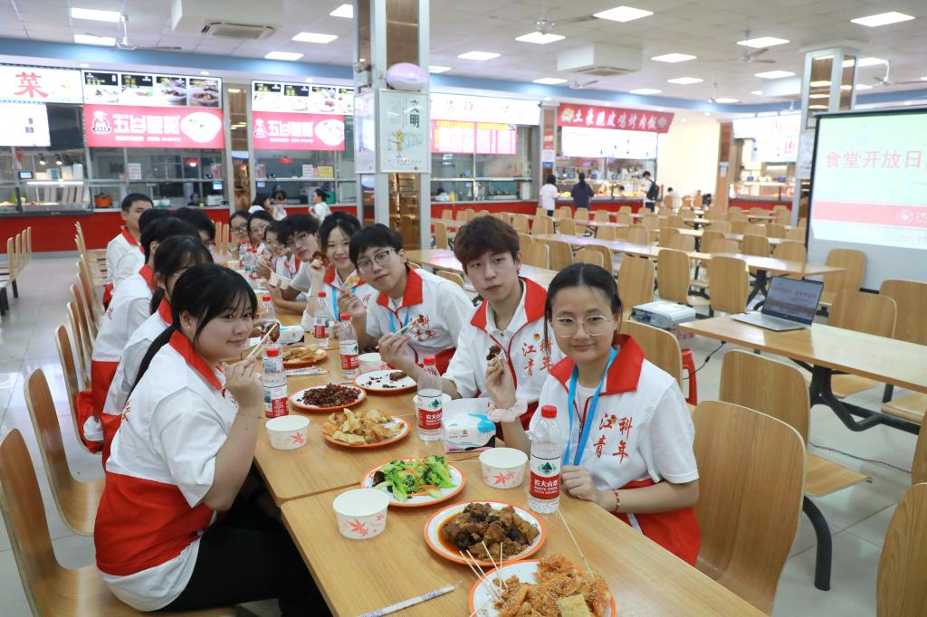 食堂后厨探秘结束后,学生代表与食堂相关工作人员围坐一堂进行面对面的“双向奔赴”。他们围绕饭菜口味风味、管理服务效率、时令菜品供应等话题展开讨论。鄱阳湖餐厅负责人还邀请学生代表们品尝食堂菜品。酱香饼、小鸡炖蘑菇、清炒西兰花、炸鸡翅、香酥鸡排、红烧肉……学生代表们细细品尝:“这个辣子鸡丁有家的味道!”菜品安全卫生、味道较好,和学生代表们在后厨看到的一致。