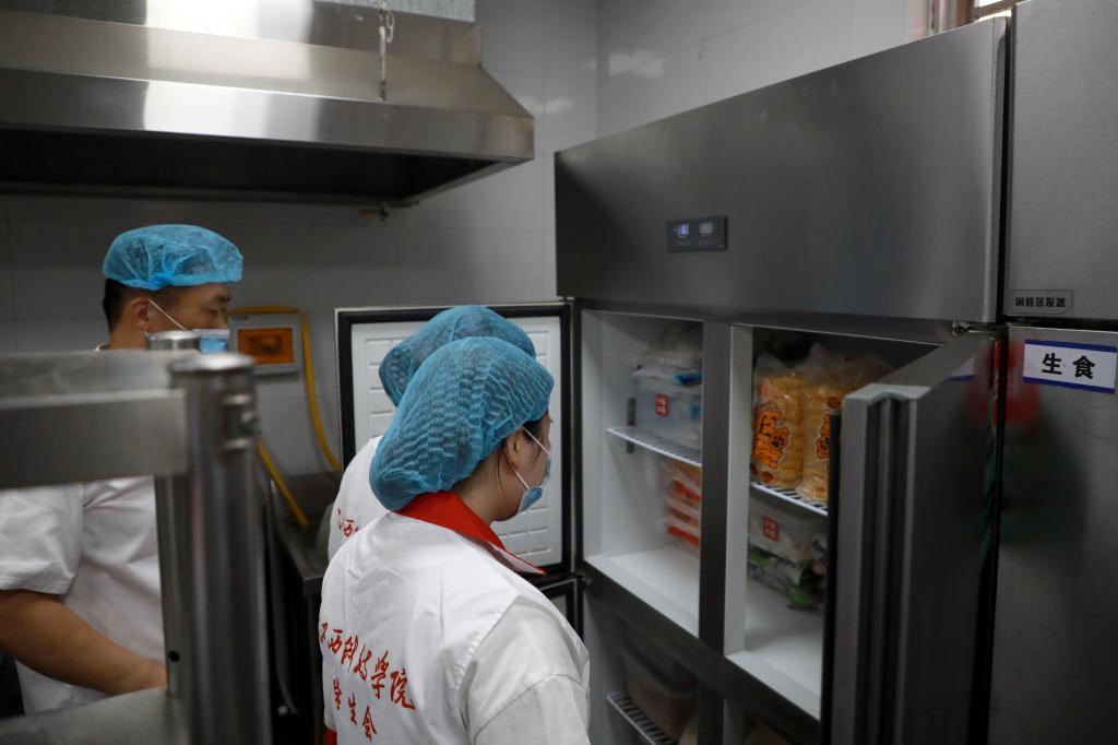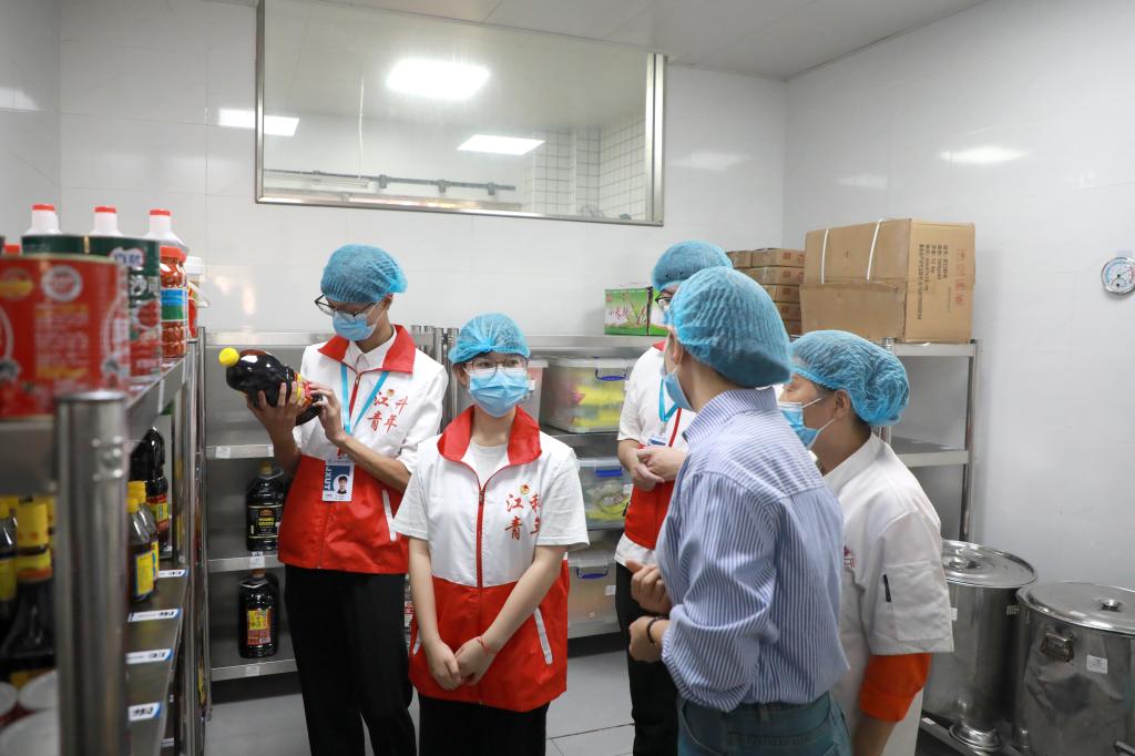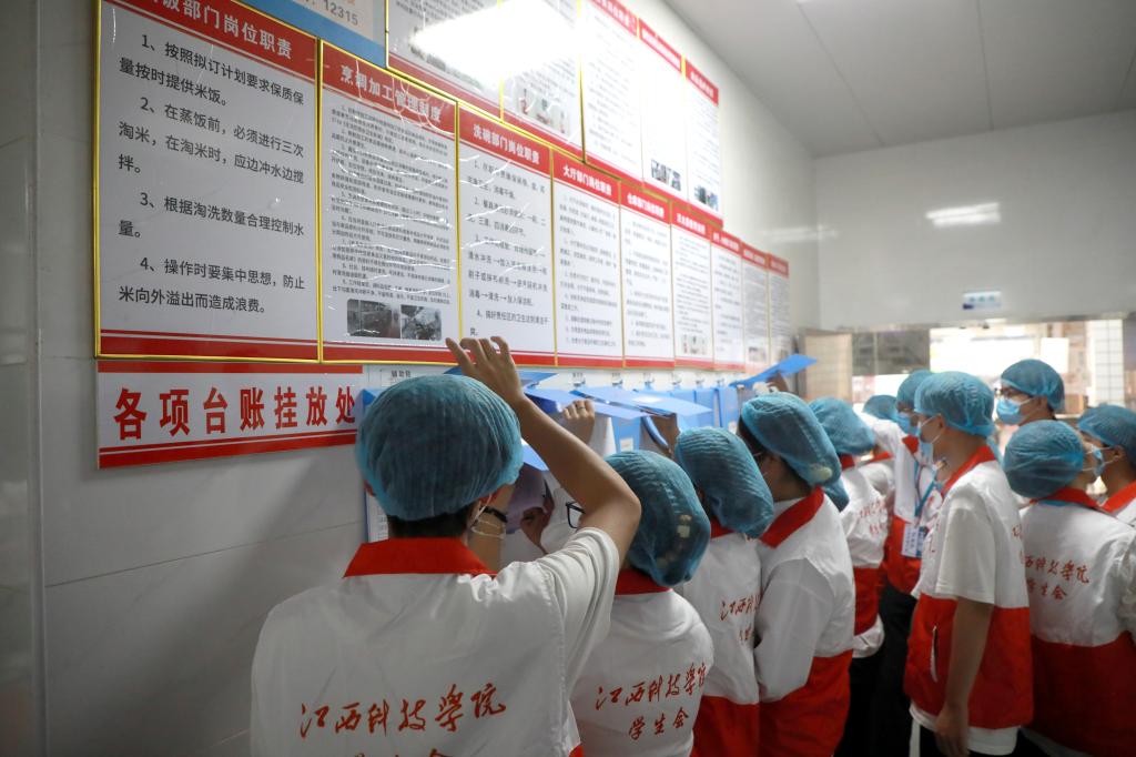 “我们的管理过程是全透明的,从源头守护‘舌尖安全’。”食堂有关负责人向学生代表们介绍了食堂后厨的安全管理理念。食品和调料储存间,物品都分类存放,能看到生产日期和保质期,整个区域干净整洁、井然有序。据了解,后厨所用的很多食材都由食堂统一采买,确保其来源正规,质量可靠、有据可循。墙面上的“明厨亮灶”监控屏同样吸引了学生代表们的目光,屏幕上实时播放着后厨操作画面——工作人员身着工作服、戴着手套有条不紊地进行着食材加工。“我们所有用具,包括菜筐、砧板、菜刀,还有餐盘、筷子、勺子等使用后都要经过严格清洗消毒,这是保障食品安全的基本。”在后厨走廊,学生代表们翻看了记录本,“我们食堂要求工作人员,要持健康证上岗,同时还定期开展技能培训提升服务水平。”食堂负责人说:“紫外线灯消毒、捕蝇灯开启、挡鼠板设置等各个环节也都一样不落。”来到食品留样区,学生代表们清楚看到每一份留样食品都严格按照规定分量留存。