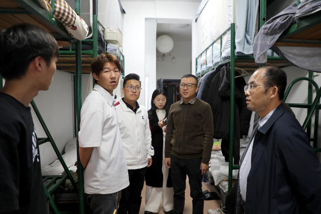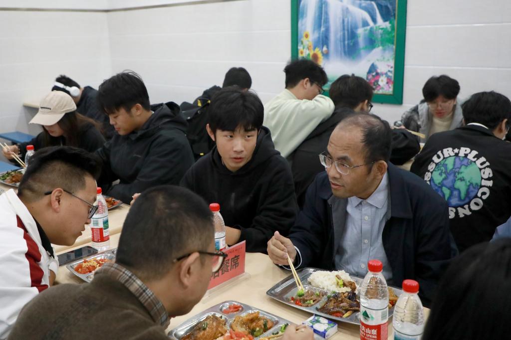 从学院离开后,陈辉副校长与同学们一同前往学生食堂共进午餐。用餐期间,他与同学们亲切畅谈,话题涵盖课堂学习、成长规划、食堂饮食口味及宿舍居住条件等多个方面,现场氛围轻松融洽。午餐后,陈辉副校长深入学生宿舍,详细询问同学们的日常生活起居及遇到的困难。他叮嘱同学们要养成良好作息习惯,合理平衡学习与休息时间,珍惜同学情谊、互助友爱,共同营造和谐的宿舍氛围;遇到问题要及时向辅导员和学校反映,学校将全力为大家的学习生活提供保障。