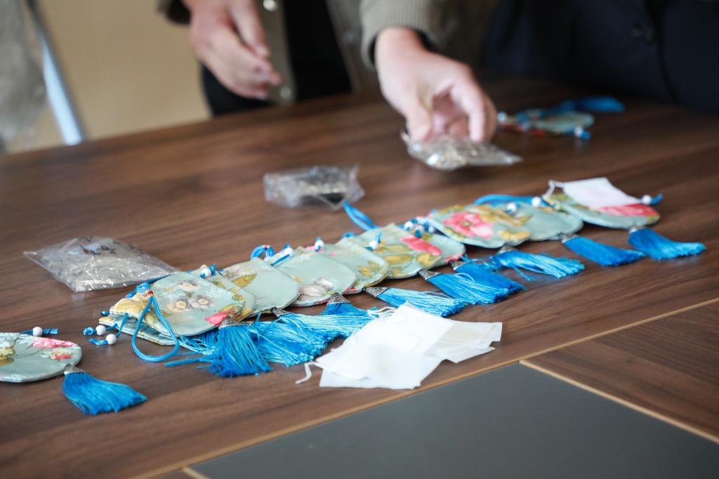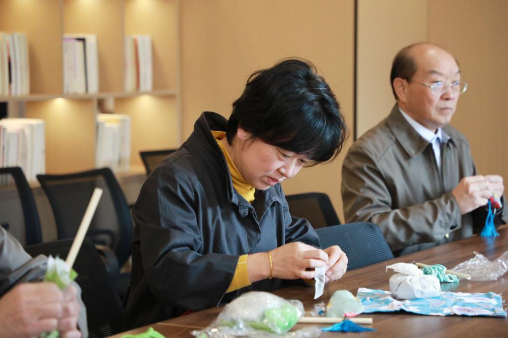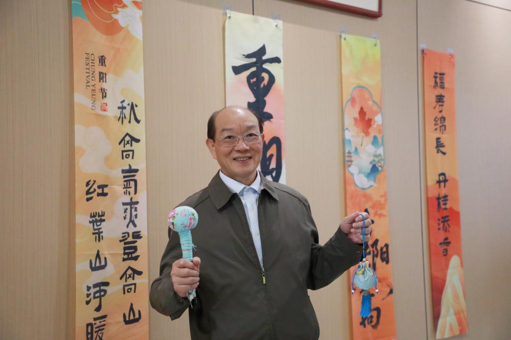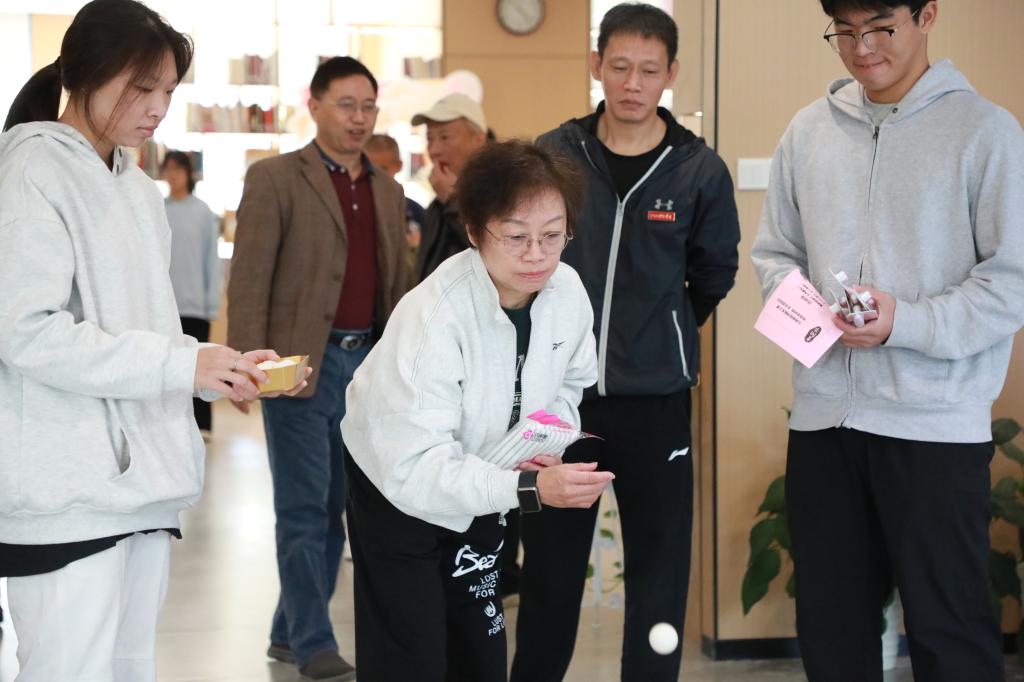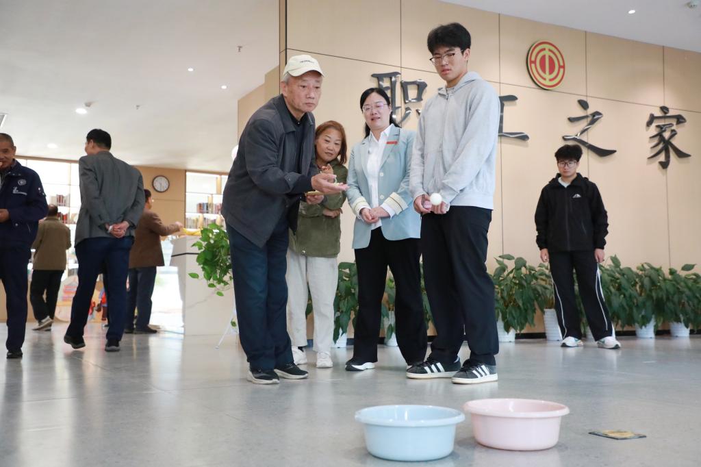 座谈会后,一场轻松愉快的游园活动在职工之家举行。游戏区内,“雅致投壶”“古风捶丸”“乒乓入盆”等趣味项目吸引了大家踊跃参与。老同志们精神矍铄,兴致勃勃,或凝神投掷,或优雅挥杆,或精准投球,现场欢声笑语不断。在手工体验区,老同志与同学们共同动手制作蕴含重阳文化内涵的茱萸香囊和艾草养生锤,在一针一线、一缠一绕中感受传统手工艺的魅力。