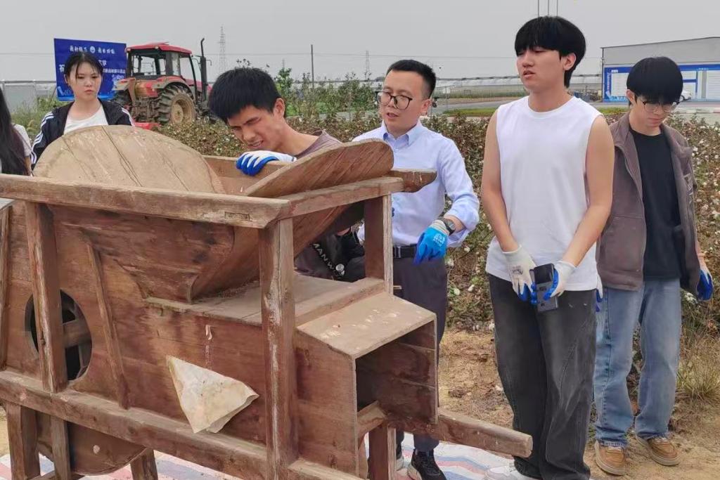 收割结束后,最具特色的高粱脱粒环节精彩上演。龙朝明亲自示范,手把手教我校首位全盲大学生黄振宇操作原始风车进行脱粒。随着风车缓缓转动,饱满的高粱籽粒与秸秆、杂质成功分离,簌簌落下堆积成小山。“以前只在书本上见过传统农具,今天亲手操作才明白其中的智慧,这不仅是一次劳动体验,更是一堂生动的传统文化课。”黄振宇同学一边擦拭额头的汗水,一边兴奋地说道。现场师生纷纷参与其中,在亲手实践中传承古老农耕技艺,感受传统劳动文化的独特魅力。