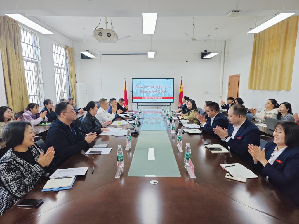 吕文威在讲话中充分肯定外国语学院在教学质量、教学竞赛和学生管理等方面取得的成绩。他指出,学院教学竞赛成果突出,大学英语教学质量显著提升,学生管理特色鲜明,充分体现学院在教学改革与人才培养方面的积极成效。他鼓励全体教职工保持良好身心状态,积极参加体育锻炼,营造健康向上、团结奋进的校园氛围。他强调,学院要以学校申硕工作为契机,进一步强化科研工作,持续聚焦专业建设和高质量发展,科学谋划师资培养与学科团队建设,全面提升学院的综合实力。他希望全体教师进一步凝聚共识、锐意进取,深化教育教学改革,充分发挥外语学科优势,积极服务学校国际化办学,为学校建设高水平应用型本科高校贡献更大力量。