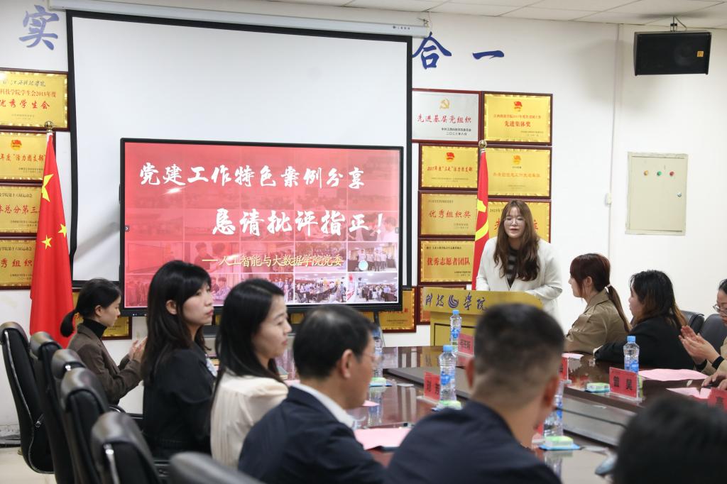 林赛华介绍人工智能与大数据学院整体情况,以及在党建“双创”工作中体制机制创新、党建品牌打造、党建与事业发展“一融双高”等方面的举措和未来建设思路。姜懿琴以“启智育人展新篇”为题,围绕“大学生党员积分卡”“党员助理辅导员制度”“党员在身边主题活动”“党员寝室亮牌”“党支部与红色班级共建”等特色项目,就学院党建“双创”品牌塑造工作进展进行专题汇报。
