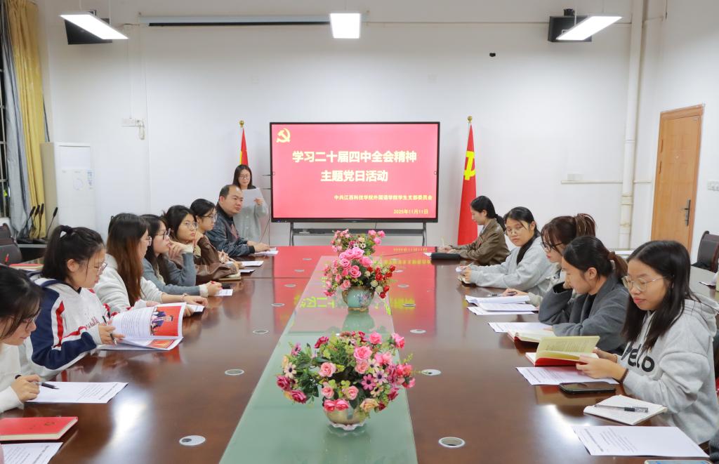 江科网讯(通讯员 范勇峰)为深入学习贯彻党的二十届四中全会精神,准确把握国家“十五五”时期发展的战略方向与目标任务,11月11日,外国语学院学生党支部开展“‘英’译全会,‘语’话未来——深入学习贯彻党的二十届四中全会精神及“十五五”规划建议”主题党日活动。活动聚焦全会公报和“十五五”规划建议核心内容,以中英双语形式传播党的创新理论,推动理论学习与专业实践深度融合。