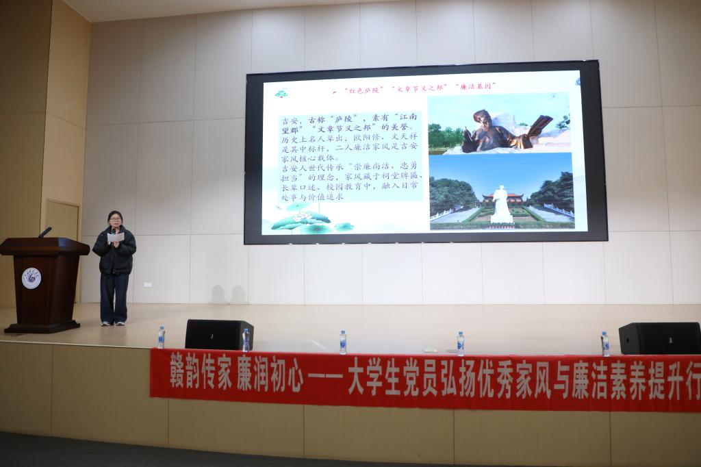 江科网讯(记者 何强江)11月20日,学术报告A厅内暖意融融、思潮涌动,由学校纪委与经济管理学院党委联合主办的“赣韵传家・廉润初心——大学生党员弘扬优秀家风与廉洁素养提升行动”在此举行。校党委副书记、纪委书记夏拥华同全校各学院党员代表、经济管理学院全体党员及入党积极分子齐聚一堂,在赣鄱文化浸润中感悟家风力量,在思想碰撞中筑牢廉洁根基。