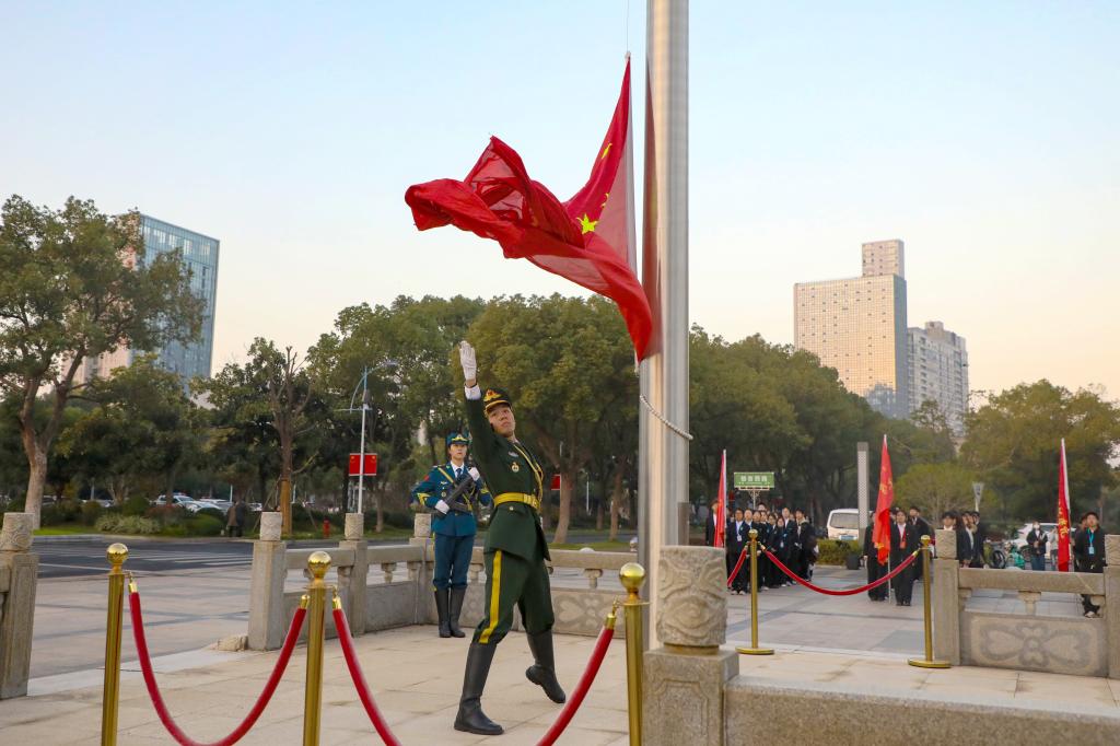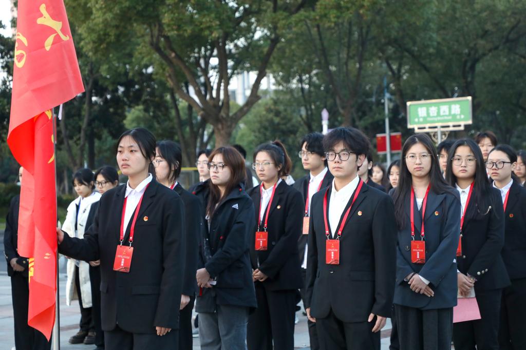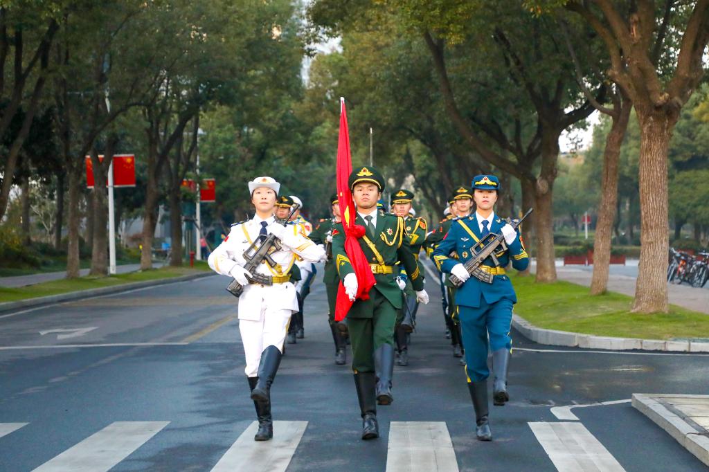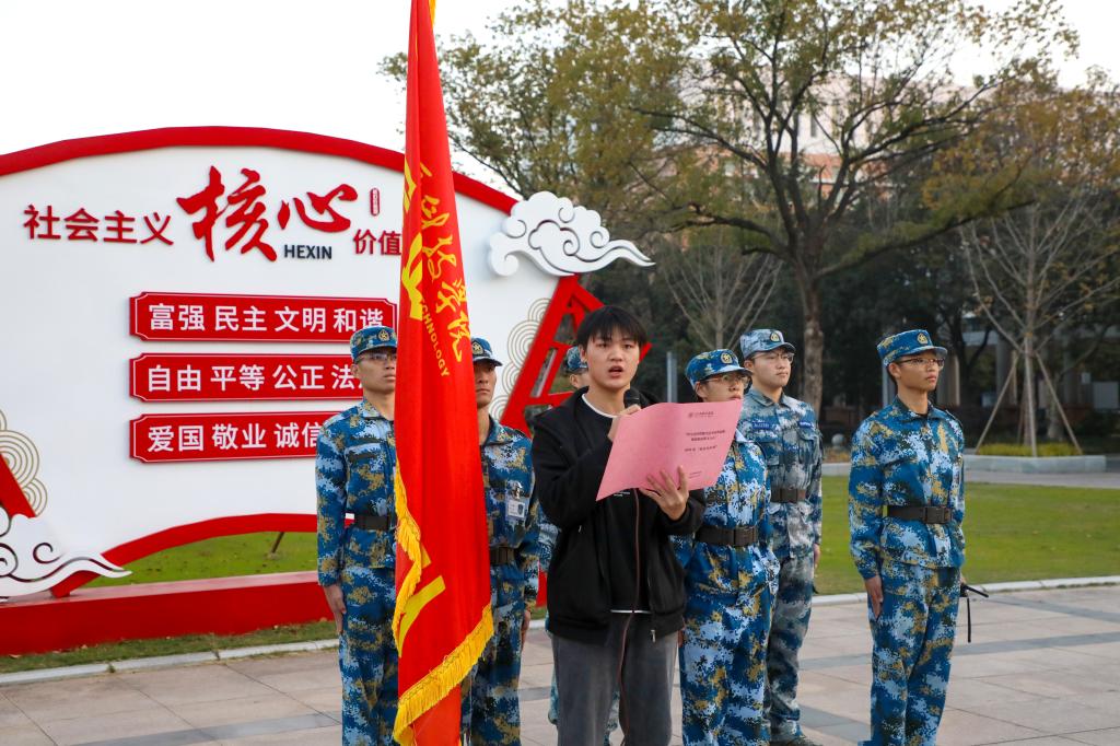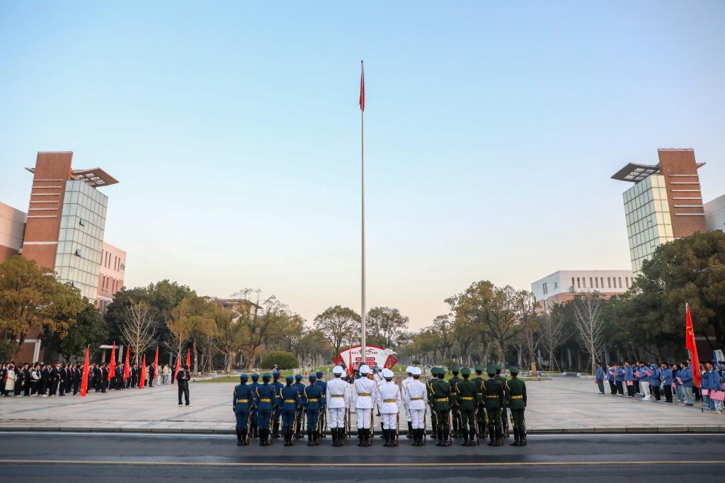活动伊始,军政教导队的同学们身着笔挺制服,迈着整齐划一的步伐,精神抖擞地护卫着五星红旗走向旗杆。伴随着雄壮激昂的《义勇军进行曲》,鲜艳的五星红旗迎着朝阳缓缓升起,全体师生肃立注目,高唱国歌,目光追随着国旗升至顶端,心中涌动着对祖国的热爱与对宪法的尊崇。
