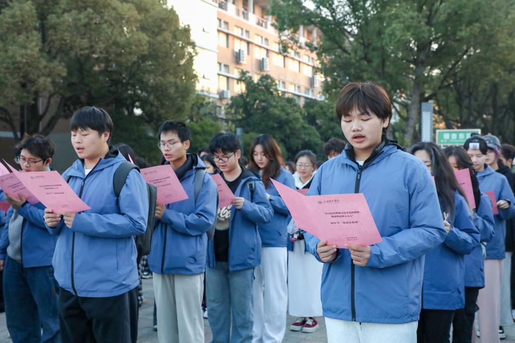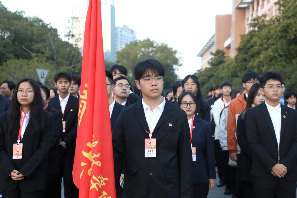 “让我们以宪法为纲、以守法为荣,在国旗下郑重承诺:不负韶华,不负时代,做尊法、学法、守法、用法的新时代青年……”升国旗仪式结束后,外国语学院刘飞荣同学作为学生代表在国旗下发言,号召同学们以遵守校规校纪为起点,认真学习宪法知识、明晰权利义务,在明辨是非中恪守法治底线,在践行责任中传递青春担当。