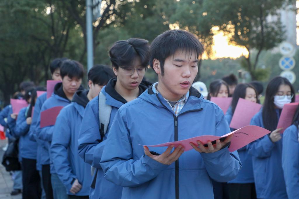 随后,“宪法晨读”环节正式启动。现场人员齐声诵读宪法序言及核心条文,“本宪法以法律的形式确认了中国各族人民奋斗的成果,规定了国家的根本制度和根本任务,是国家的根本法,具有最高的法律效力……”铿锵有力的诵读声回荡在校园上空,每一个字、每一句话都传递着对宪法权威的敬畏。沉浸式的晨读体验,让师生们在逐字逐句的品读中,直观感受宪法的严谨性与权威性,进一步加深对宪法原则、宪法精神的理解,也让法治观念更加深刻地融入青春血脉。参与国旗护卫的军政教导队成员余恩说道:“能亲手护卫国旗升起,再和大家一起晨读宪法,我更加明白青年不仅要爱国,更要懂法守法,用实际行动维护宪法权威,担当起新时代青年的责任。”