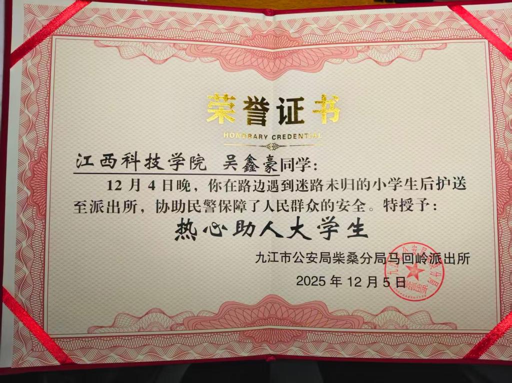 就在此时,放假路过的我校人工智能与大数据学院00后大学生吴鑫豪注意到这个独自徘徊的小小身影。他立刻停下脚步,主动蹲下身,用温和的语气轻声询问:“小弟弟,怎么一个人在这里?”简单的一句关切,如同寒夜中的一束光,驱散了小王心中的恐惧。在了解到小王迷路且无法联系家人的情况后,吴鑫豪没有丝毫迟疑,当即决定将孩子送往最安全的地方——辖区马回岭派出所。