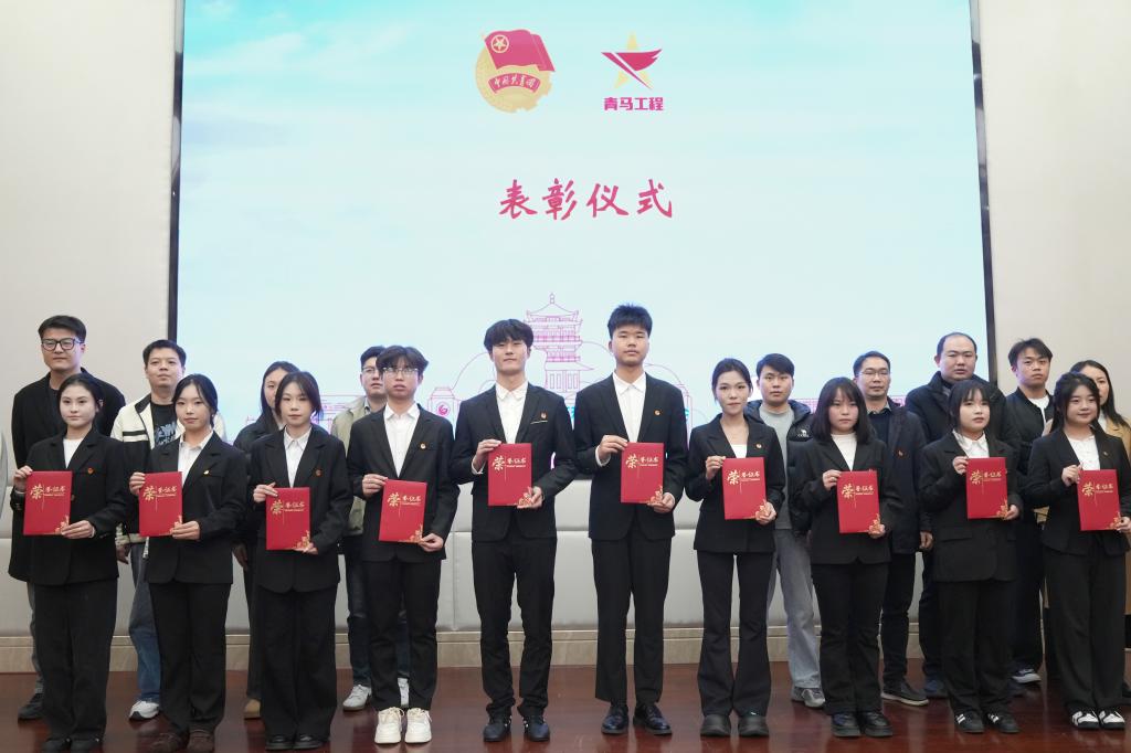 仪式上,校党委组织部副部长程强斌宣读第十四期培训班结业决定及表彰决定,现场为优秀学员代表颁发荣誉证书;校团委组织部部长邱成汇报“蓝园之星”大学生骨干培训班的发展历程与培养体系,详细介绍理论教学、素质拓展、社会实践等多维度培养模式。第十四期优秀学员代表、文化与传媒学院明晓徽同学分享成长感悟,第十五期学员代表、音乐舞蹈学院崔俊婕同学代表全体学员作表态发言。