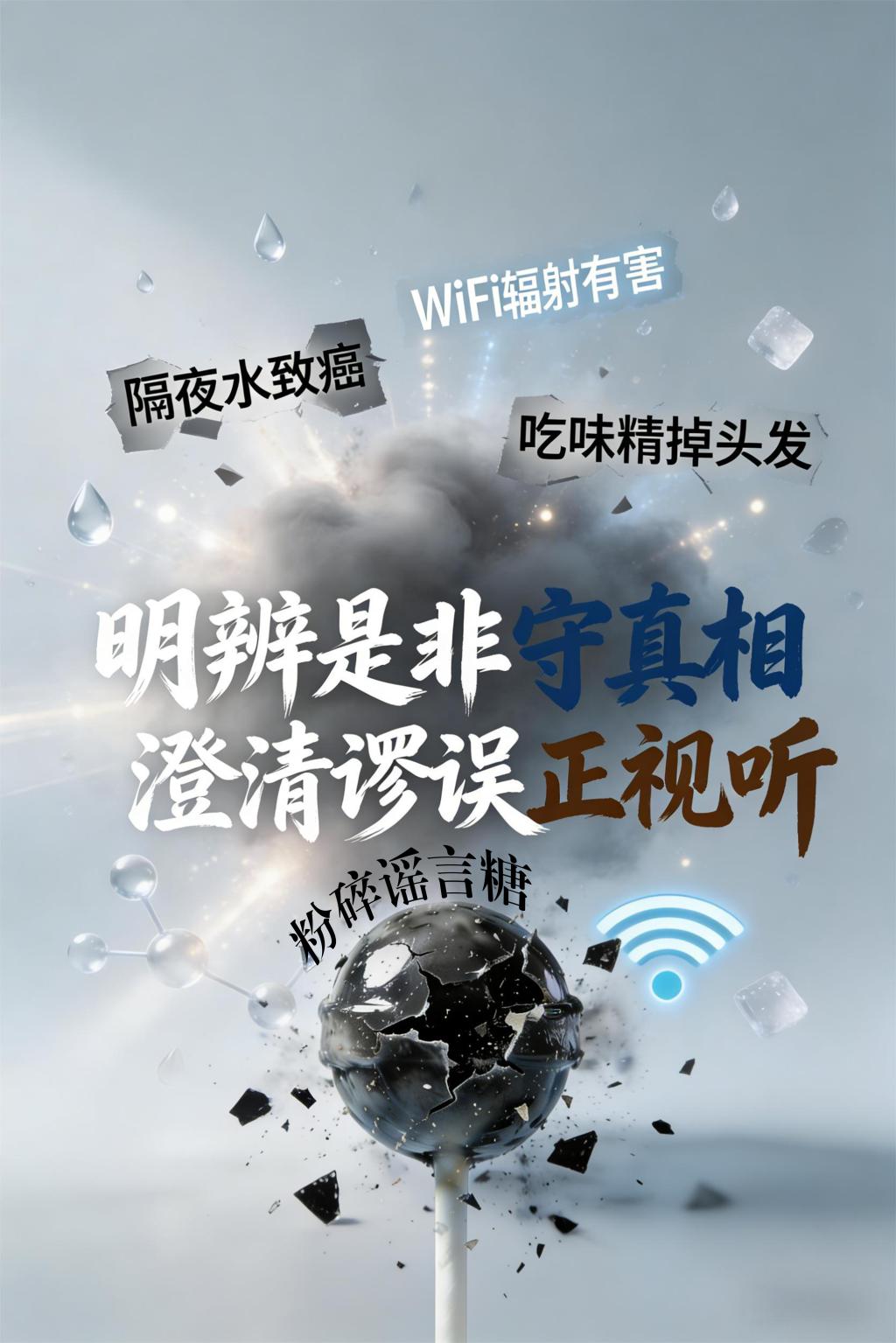 作品简介:在信息爆炸的当下,各类伪科学谣言借助社交平台快速传播,误导公众认知,尤其对健康生活类谣言的辨别需求日益迫切。本作品以“粉碎生活谣言,守护科学认知”为核心,聚焦“隔夜水致癌”WiFi辐射有害”吃味精掉头发”等常见健康误区,倡导理性辨别信息、坚守科学真相。通过视觉化的“粉碎”意象,直观破除谣言的迷惑性,传递科学思维,帮助公众建立对健康信息的理性判断能力,筑牢科学认知防线。作品以简洁有力的视觉语言,易于在社交媒体等渠道快速传播,有效提升公众对健康谣言的警惕性,推动科学知识的普及与科学精神的弘扬。
