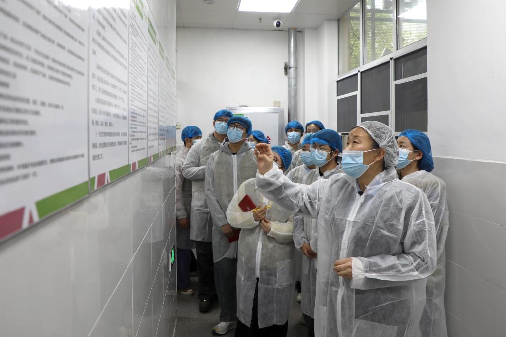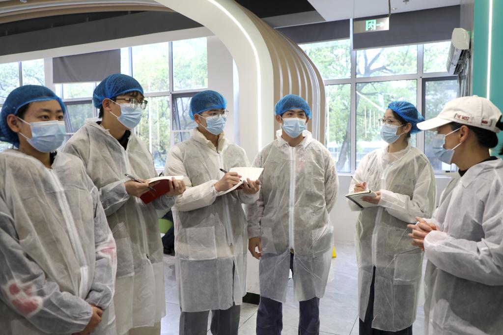 同学们严格遵守食堂卫生管理规范,统一佩戴防尘帽、口罩和防护衣裙后,在食堂工作人员的带领下,有序进入后厨区域,依次参观加工烹饪区、切配间、毛菜间、菜品售卖区、一次更衣室、二次更衣室等功能区域,同时细致查看食堂明厨亮灶监控系统。参观过程中,食堂工作人员逐一讲解各区域的用途、操作规范和卫生管控标准,全程展示食材从验收、分拣、清洗、切配到烹饪、售卖的全流程细节。