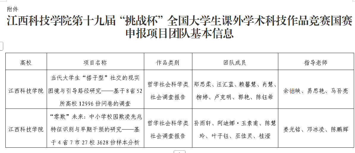 附件:江西科技学院第十九届“挑战杯”全国大学生课外学术科技作品竞赛国赛申报项目团队基本信息