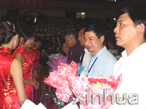 新华网江西频道9月11日电(曾扬)2006年9月10日,江西蓝天学院在省体育馆隆重召开庆祝教师节暨新学员开学典礼活动。为表达感恩之心,学子们纷纷向辛勤培育自己的教师代表献上美丽的鲜花。江西蓝天学院自开办一来,一直注重营造尊师重教氛围,促进了学校的健康发展。学校办学13年来,已培养8万多合格人才,就业率在97%以上。