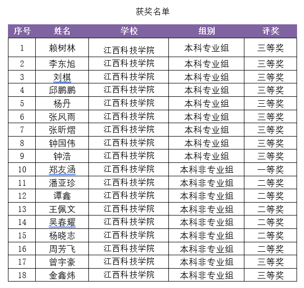 江科网讯(通讯员 张常泉)日前,由省教育厅主办,南昌大学承办的2019年江西省大学生信息技术知识大赛落下帷幕。我校参赛选手经过前期的初选、复选两轮选拨,最终从全校逾千人的报名学生中选出171人代表学校与省内其他高校学生同场竞技。经过激烈角逐,我校共获得本次竞赛本科专业组三等奖9项,本科非专业组一等奖1项、二等奖6项、三等奖8项,以及专科非专业组二等奖1项、三等奖3项,专科非专业组一等奖1项、二等奖1项、三等奖2项。具体获奖名单如下表: