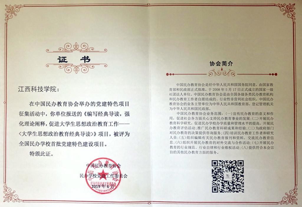 会上,我校党委推荐的党建项目《编写经典导读,强化理论阐释,促进大学生思想政治教育工作——<大学生思想政治教育经典导读>》”被评为“全国民办学校首批党建特色建设项目”,学校被授予“全国民办学校党建特色项目建设基地”。我校申报的项目材料收录到《全国民办学校党建特色项目汇编》。