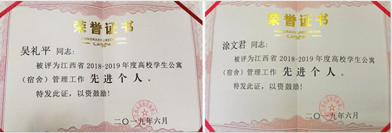 江科网讯(记者 何强江)近日,江西省高校后勤协会学生公寓管理专业委员会2019年年会在南昌召开。会议表彰了年度全省高校学生公寓管理先进单位、先进个人和公寓管理优秀工作案例。我校荣获“2018年度江西省高校学生公寓(宿舍)管理先进集体”,涂文君和吴礼平两位老师获评“江西省2018—2019年度高校学生公寓(宿舍)管理工作先进个人”荣誉称号。