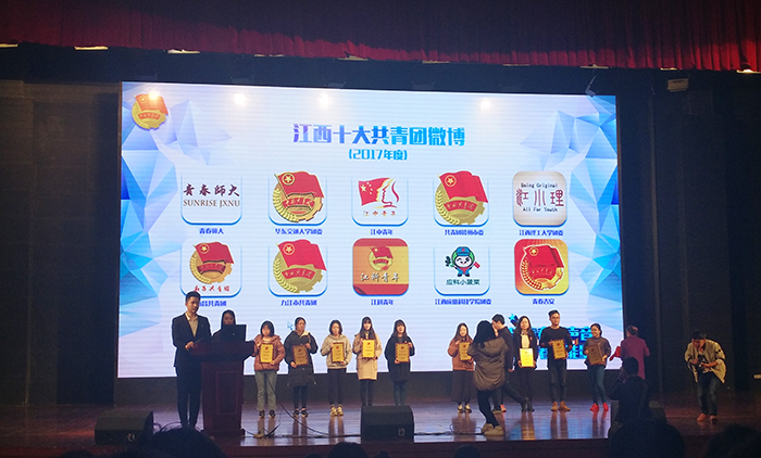 江科网讯(通讯员 过其琦 罗诗镁)3月13日下午,由共青团江西省委主办的“发出青年好声音 凝聚青春正能量”2018江西共青团网络新媒体工作颁奖典礼在全国青少年井冈山革命传统教育基地举行,团省委宣传部部长范伟、副主任科员宋嗣伟出席并颁奖,来自全省各地各单位的300多名网络新媒体工作骨干参加。我校团委荣获“2017年度江西省十大共青团微博”、“2017年度江西十大省属本科团委微博”两项荣誉,罗诗镁同学荣获“2017年度全省共青团网络新媒体工作先进个人”称号。