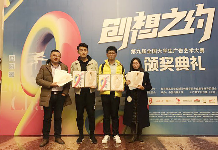 江科网讯(通讯员 郑鹏 徐驰)由中国高等教育学会、教育部高等学校新闻传播学类专业教学指导委员会主办的第九届全国大学生广告艺术大赛落下帷幕。近日,大赛颁奖仪式在北京政协大礼堂举行。本次比赛共有1301所高校(2819所学院)参赛,参赛学生超过80万。经校级初选后,共收到作品173870组(约36万件)。我校艺术设计学院2015级创新班学生林锐、刘学文等荣获全国三等奖2项、优秀奖4项。学院教师郑鹏、徐驰带队参加了颁奖仪式。
