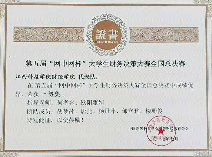 江科网讯(通讯员 路丕军 李华)近日,第五届“网中网杯”大学生财务决策大赛全国总决赛在南京落幕,我校财经学院胡梦萍、杨丹萍、邹立君、楼珊俊、唐燕等五位同学组成的代表队在本次比赛中斩获一等奖,指导老师何孝容、欧阳雅婧获“最佳指导老师”奖。这是迄今为止江西省高校在此项竞赛中获得的首个一等奖。