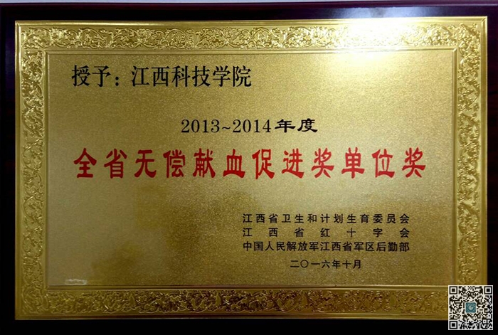 江科网讯(通讯员 余兴)近日,省卫生和计划生育委员会、省红十字会、省军区后勤部联合发布《关于表彰2013-2014年度全省无偿献血先进单位和个人的决定》(赣卫医字【2016】164号),我校喜获2013-2014年度江西省“无偿献血促进奖单位奖”荣誉称号。