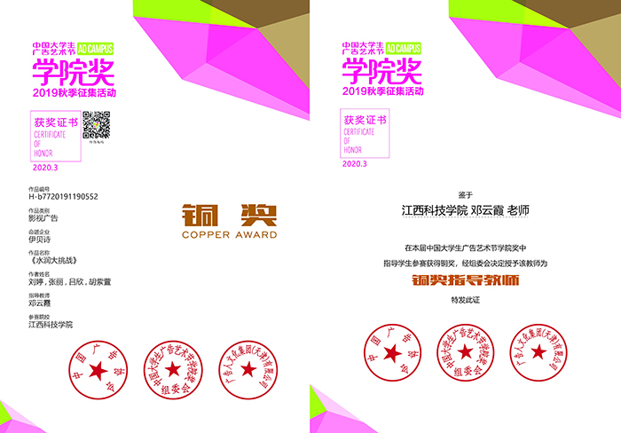 江科网讯(通讯员 张易)近日,2019年中国大学生广告艺术节学院奖秋季征集活动公布获奖名单,由我校文化与传媒学院学生刘婷、张丽、吕欣、胡紫萱等创作的作品《水润大挑战》(指导老师:邓云霞)荣获影视广告类全国铜奖。该学院师生积极践行成果导向理念,落实“课赛练”三位一体教学改革,在此次比赛中共获奖31项,其中铜奖1项,优秀奖10项,入围奖20项。获奖指导教师中,邓云霞老师被评为铜奖指导教师,贾翔羽、胡育丹、向永心、龚彦艳、杨雅婷等老师被评为优秀指导教师。