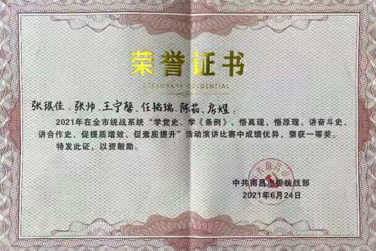 江科网讯(通讯员 沈奕霏 马明扬)近日,由南昌市委统战部举办的“学党史、学《中国共产党统一战线工作条例》,悟真理、悟原理,讲合作史、讲奋斗史”主题演讲比赛圆满落幕。我校音乐舞蹈学院学生房煜、陈茹、任韬瑞、王宁馨、张帅、张琪佳共同演绎的作品《不朽的军魂》(我校九三学社社员、音乐舞蹈学院马明扬老师指导)获一等奖。