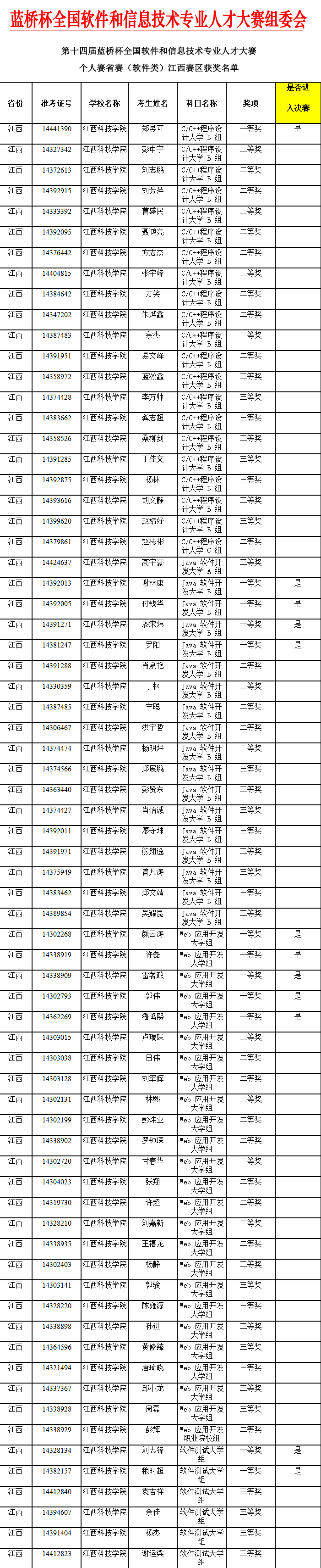 江科网讯(通讯员 张志龙)近日,第十四届“蓝桥杯”全国软件和信息技术专业人才大赛——个人赛省赛结果公布。我校88名优秀学子经过刻苦的训练、持续不懈的努力,在江西赛区中脱颖而出,喜获佳绩。其中,省级一等奖13名、省级二等奖31名、省级三等奖44名。其中,获得省级一等奖的13名同学将代表学校参加2023年6月10日举办的第十四届蓝桥杯全国总决赛。