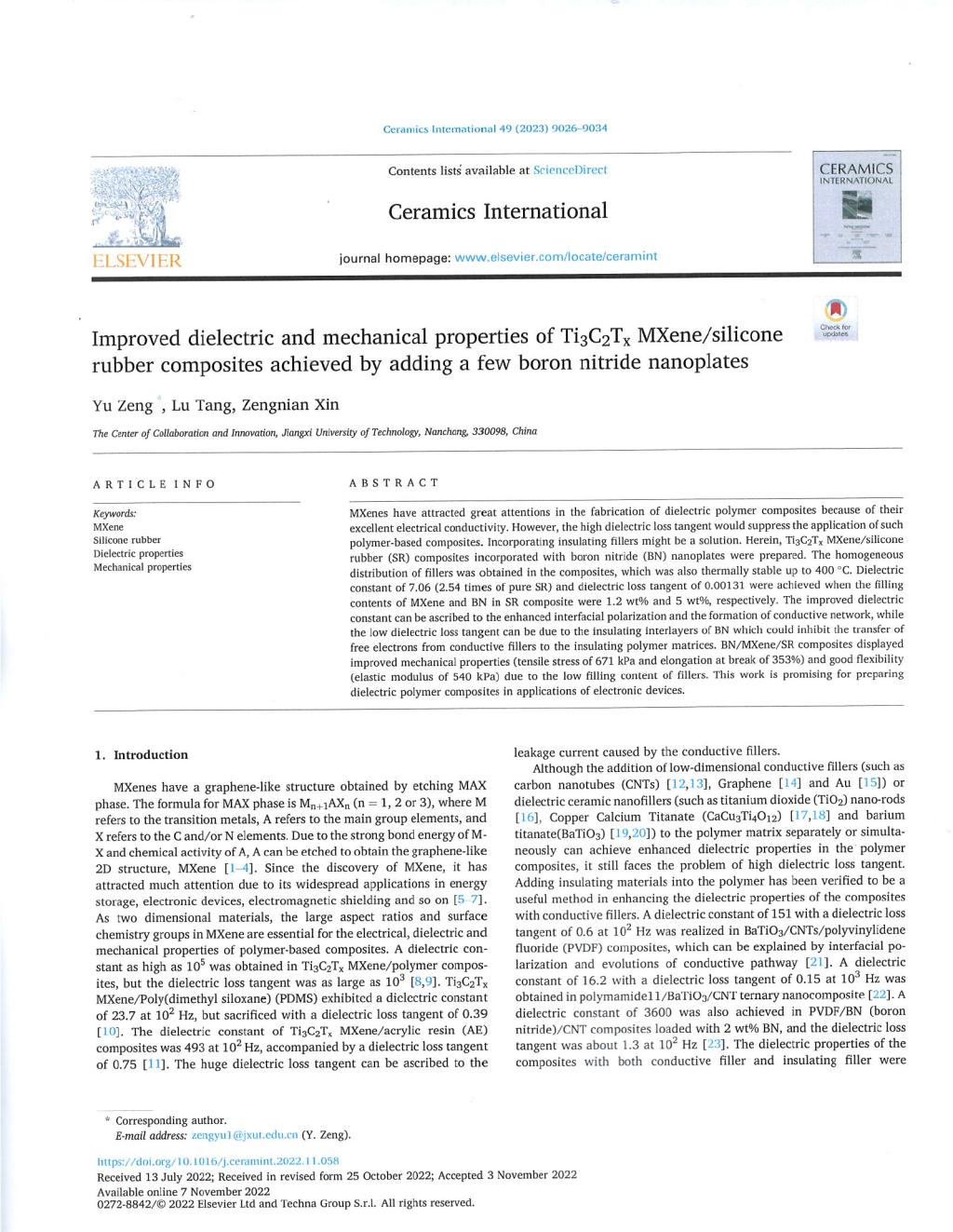 江科网讯(通讯员 张乐芳)日前,我校协同创新中心曾玉博士在《Ceramics International》上发表题为“Improved dielectric and mechanical properties of Ti3C2TxMXene/silicone rubber composites achieved by adding a few boron nitride nanoplates“的学术论文。《Ceramics International》期刊属于SCI一区(中科院分区升级版),影响因子5.532。