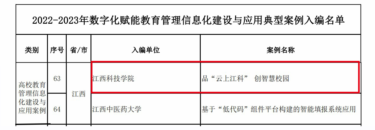 江科网讯(记者 何强江)日前,教育部教育管理信息中心公布2022-2023年数字化赋能教育管理信息化建设与应用典型案例评选结果,我校典型案例《品“云上江科” 创智慧校园》(高校教育管理信息化建设与应用案例)成功入选(全省仅7个),成为江西省2所本科高校入选案例之一。