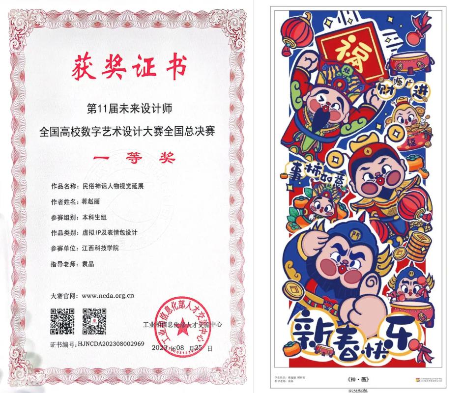 其中,由顾军创作的《之茶》(指导老师:黄静瑶、曾宪洲),龚声伟创作的《秦淮灯会IP形象设计》(指导老师:鲍艳),范钱婷、顾青青创作的《纳西棒棒会》(指导老师:吴杨),蒋赵丽创作的《民俗神话人物视觉延展》(指导老师:袁晶)荣获国家级一等奖。车汶徽创作的《白小豚家族》(指导老师:周姗、胡慧青),严嘉雯创作的《林源古迹-上海广富林遗址互动H5》(指导老师:袁晶),许雅琳创作的《沉月岭》(指导老师:袁晶),俞裕龙、林楷涵、陈恩琪创作的《畲族服饰元素在家居设计中的应用》(指导老师:曹菲菲、陈虹),刘欣然创作的《莫比乌斯》(指导老师:黎嘉婕)荣获国家级二等奖。林海艳创作的《物声》(指导老师:胡慧青、周姗),张佩颖、陈梦雅创作的《“纯本海味”即食海产品包装》(指导老师:周姗、胡慧青),程琳创作的《千岛秘境》(指导老师:邓明慧、高圣斐),潘蕴僖创作的《童心神话》(指导老师:刘玢),方雅洁、徐心蕾、吴亚琼创作的《黑厨》(指导老师:黎嘉婕)荣获国家级三等奖。黄静瑶、曾宪洲、鲍艳、吴杨、袁晶等5位老师荣获全国优秀指导教师,肖雅婷老师荣获全国优秀组织教师。
