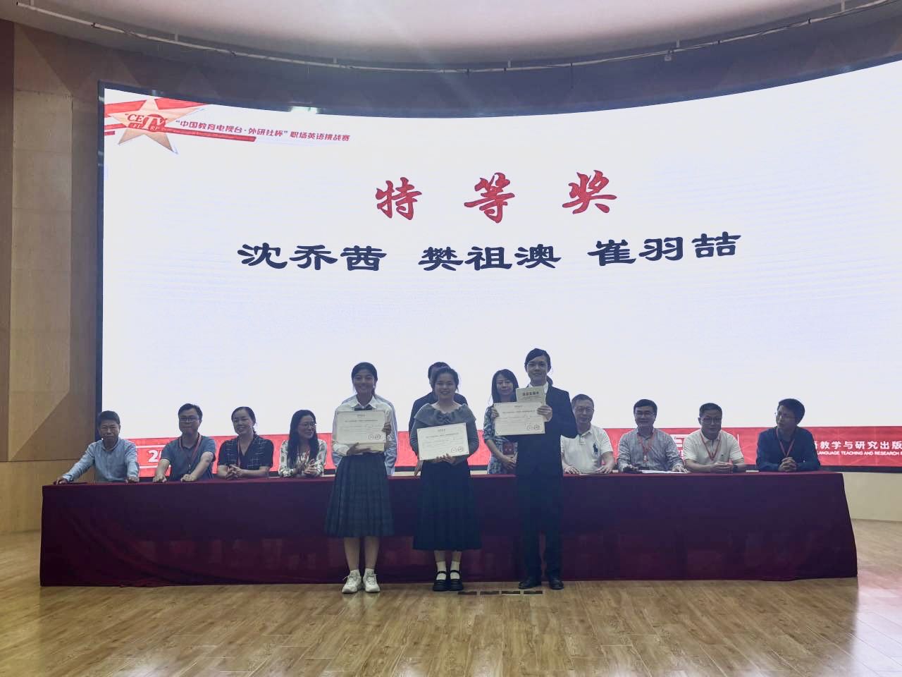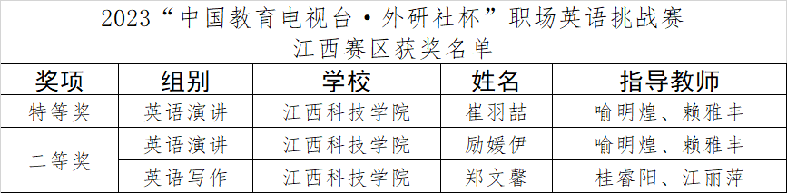 在江西赛区决赛中,我校共派出17名选手参赛,最终荣获7项大奖。外国语学院学子崔羽喆(指导教师:喻明煌、赖雅丰)获英语演讲组特等奖,励媛伊(指导教师:喻明煌、赖雅丰)、郑文馨(指导教师:桂睿阳、江丽萍)分获英语演讲组以及英语写作组二等奖,外国语学院学子孙爱莲(指导教师:廖海威、彭煜文)、曾欣悦(指导教师:李思睿)分获英语笔译组以及英语口译组银奖,外国语学院学子赵宇宸(指导教师:鄢进新、胡梦婷)、金慧雪(指导教师:廖海威、彭煜文)分获英语阅读组以及英语笔译组铜奖。