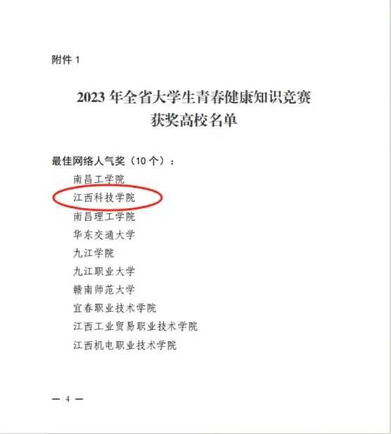江科网讯(记者 何钰馨)日前,由省卫健委、省教育厅、省计划生育协会联合公布2023年全省大学生青春健康知识竞赛获奖名单,我校荣获最佳网络人气奖,我校学工处唐喜龙荣获优秀指导老师称号。