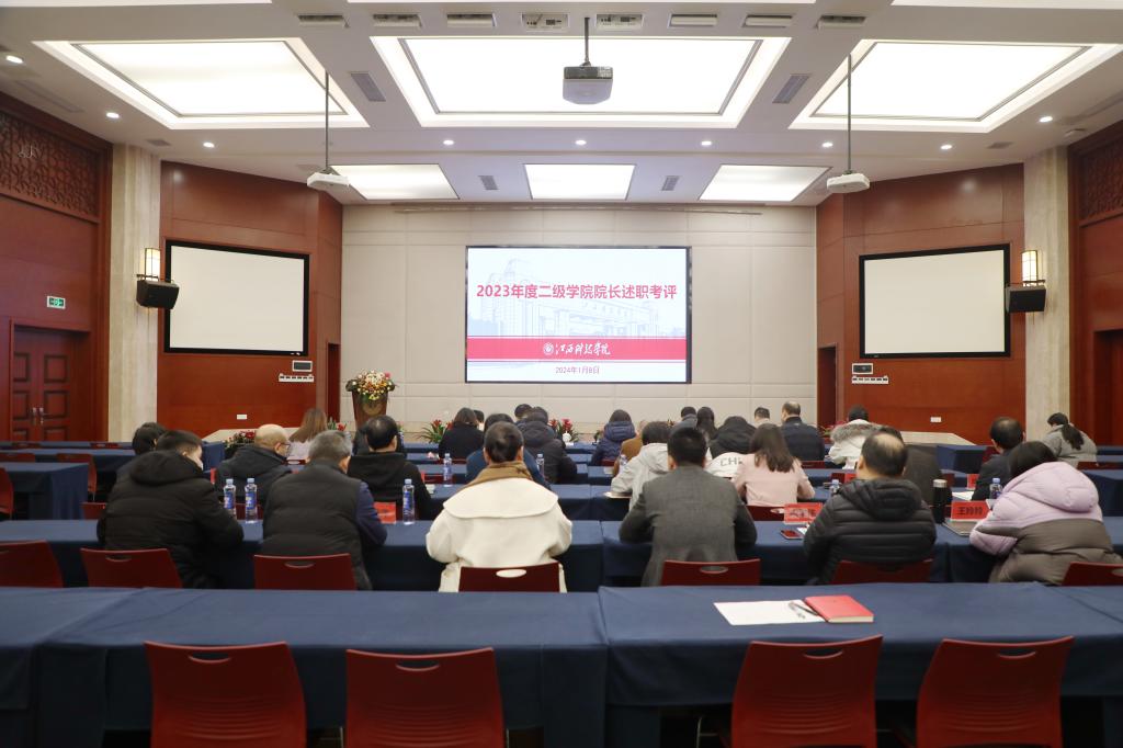 张海涛校长作点评讲话,代表学校向各学院院长的工作成效表示高度肯定与真诚感谢。她指出,2023年是繁忙艰辛的一年,也是收获满满的一年。这一年,学校在大家的共同努力下,取得了大踏步的发展,通过一次次喜报喜讯、一场场文体活动、一项项卓越成绩,实实在在地彰显了“实力江科、活力江科、魅力江科”风采。她强调,“上面千条线,下面一根针”,院长在贯彻落实学校工作中发挥着举足轻重的作用。学校高度重视院长年终述职考评工作,旨在通过述职全面了解院长工作,进一步加强沟通交流,牢固树立“全校一盘棋,上下一条心”思想。各学院院长要深入思考,进一步规范述职工作。准确理解述职考评工作要求,在述职中充分体现个人工作;规范书面用语,规避错误提法,提升职业素养。要上下齐心,不折不扣落实学校布置的工作。围绕中心抓发展,提高谋划能力,一切工作围绕人才培养这个核心来抓发展,做到关爱学生、尊重老师。围绕重点抓落实,提高执行能力,在“日常工作日常做,例行工作例行做”的同时,抓牢重点、难点,坚守一线攻坚克难,带头“啃硬骨头”。围绕不足抓改进,提高纠偏能力,关注突发情况、关键问题、新变化、不足短板,抓改进、抓弥补,带领学院发展蒸蒸日上。最后,张海涛校长希望大家以30周年校庆为新的起点,以更加积极向上的姿态谋划好2024年工作,凝心聚力、真抓实干,推动学校发展再创辉煌,以中国式现代化全面推进强国建设、民族复兴伟业作出更大贡献。