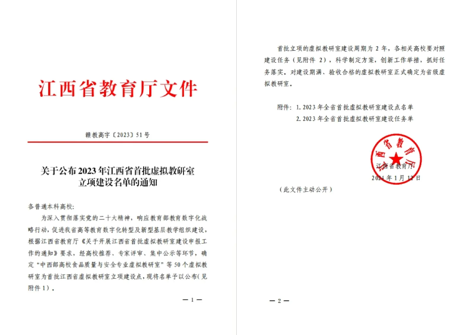 据悉,江西省首批虚拟教研室立项建设积极响应教育部教育数字化战略行动,旨在促进我省高校教育数字化转型及新型基层教学组织建设,全面提高教师教书育人能力。本次评选经各高校推荐、专家评审、集中公示等环节,共计确定50个省虚拟教研室立项建设点。