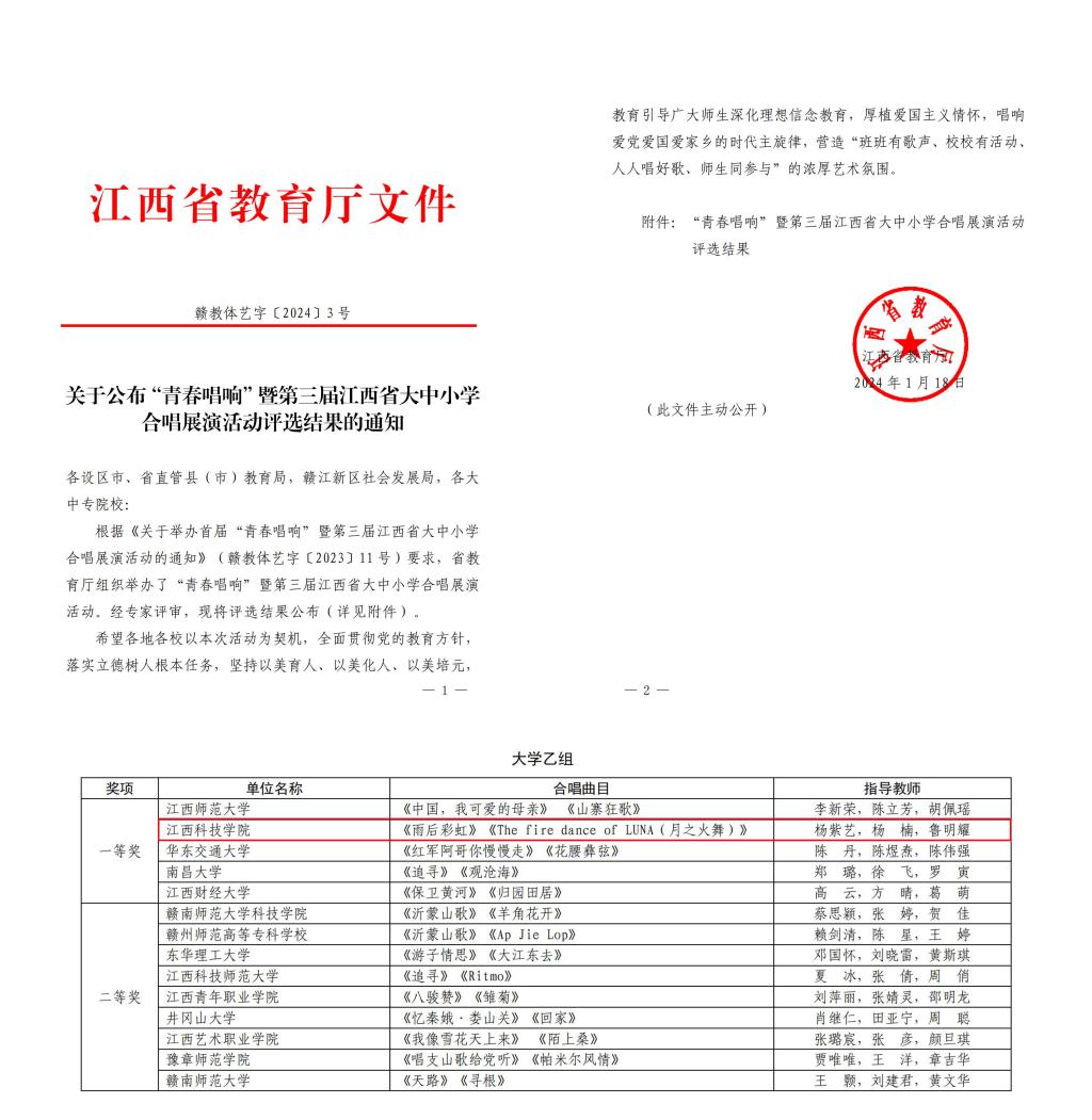 江科网讯(通讯员 鲁明耀)近日,首届“青春唱响”暨第三届江西省大中小学合唱展演活动圆满落幕,我校音乐舞蹈学院“蓝天之声”合唱团凭借《雨后彩虹》《The fire dance of LUNA(月之火舞)》(指挥:杨紫艺老师)两首作品荣获大学乙组一等奖。