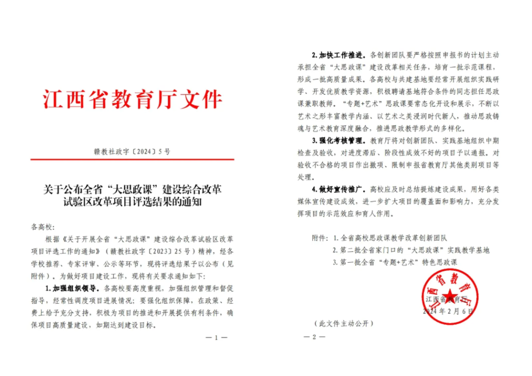 江科网讯(记者 何钰馨)近日,省教育厅公布了全省“大思政课”建设综合改革试验区改革项目评选结果。由我校申报共建的江西省女子强制隔离戒毒所获批“第二批全省家门口的‘大思政课’实践教学基地”,音乐舞蹈学院院长陈丽、马克思主义学院院长王玲玲作为课程负责人分别申报的课程《弘扬长征精神,凝聚青春力量之< 红草鞋>》《为孝之道》获批“第一批全省‘专题+艺术’特色思政课”。