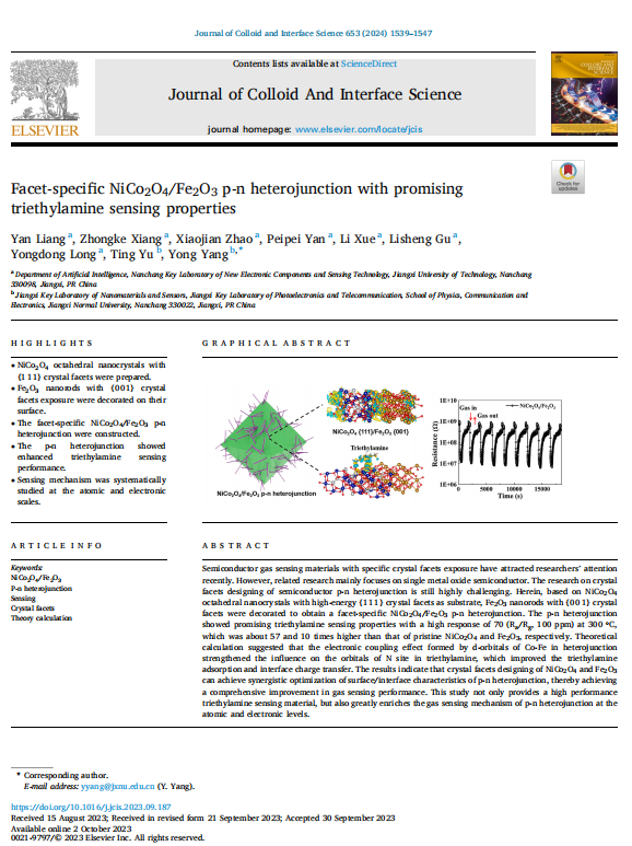 江科网讯(通讯员 李红英)近期,我校人工智能学院梁艳博士的学术论文《Facet-specific NiCo2O4/Fe2O3p-n Heterojunction for Enhanced Triethylamine Sensing Applications》在国际知名期刊《Journal of Colloid and Interface Science》(SCI一区,中科院分区升级版,影响因子9.9)上发表。该论文主要研究特定晶面暴露的NiCo2O4/Fe2O3p-n异质在挥发性有机化合物(VOCs)检测中的应用。