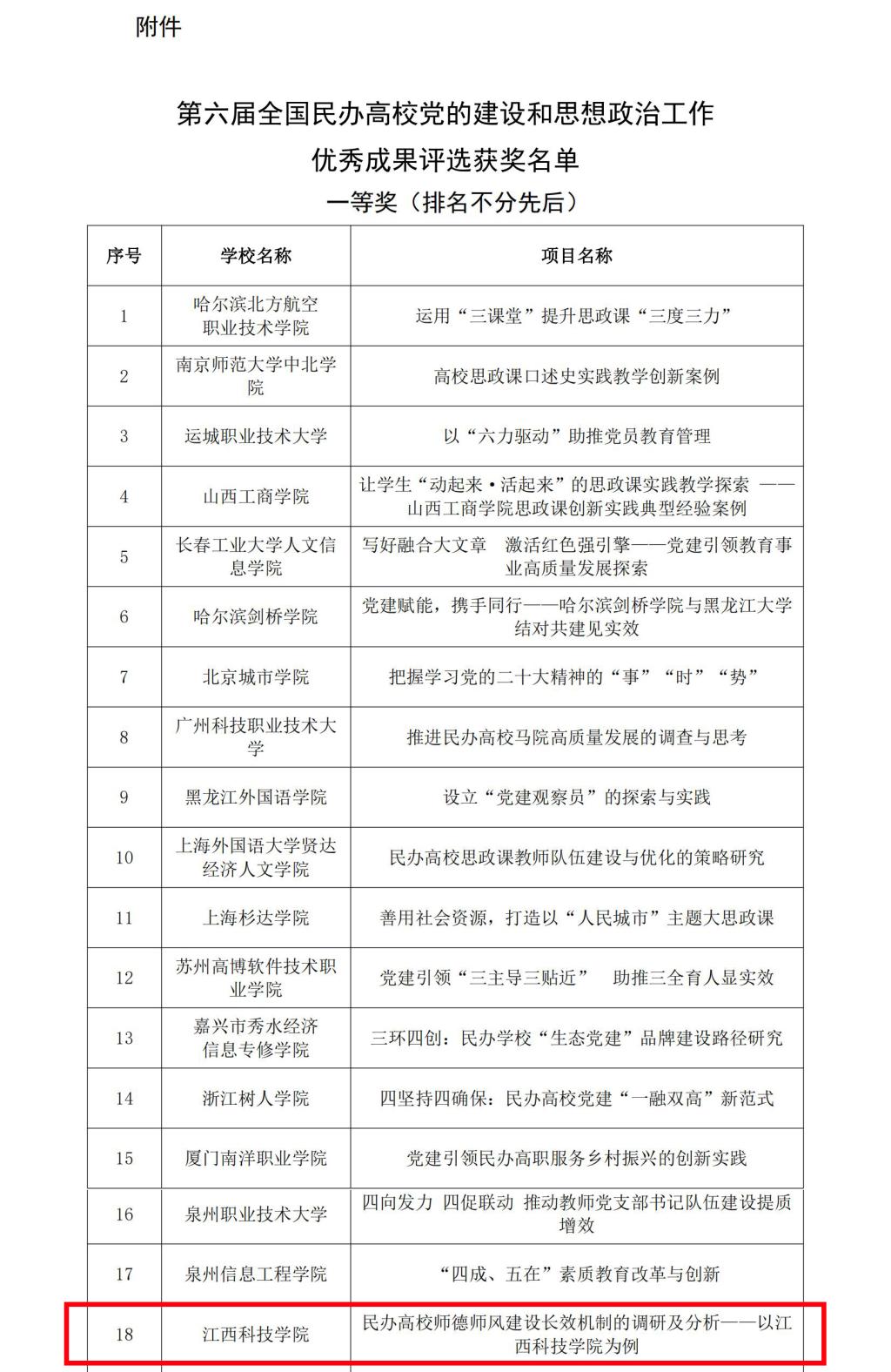 江科网讯(通讯员 余兴)近日,由教育部思想政治工作司指导,中国民办教育协会党建专业委员会主办的第六届全国民办高校党的建设和思想政治工作优秀成果评选结果揭晓。我校申报的研究成果《民办高校师德师风建设长效机制的调研及分析——以江西科技学院为例》荣获一等奖。
